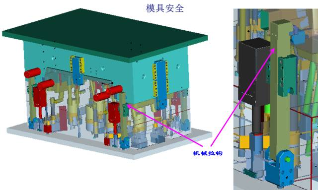 為了保證開模時(shí)斜頂跟前模一起同步運(yùn)動(dòng),以使產(chǎn)品變形而脫模,當(dāng)頂出機(jī)構(gòu)同前模同步運(yùn)動(dòng)60MM后, 前/后模部分分離,這樣保護(hù)了模具,也保證了產(chǎn)品不會(huì)被拖傷!